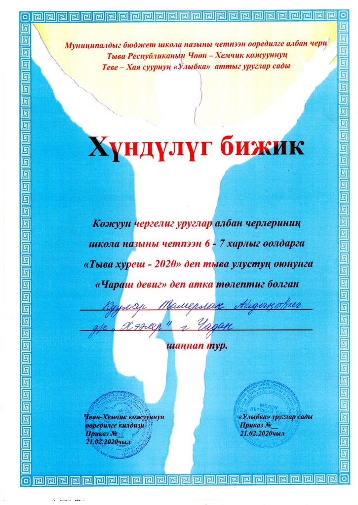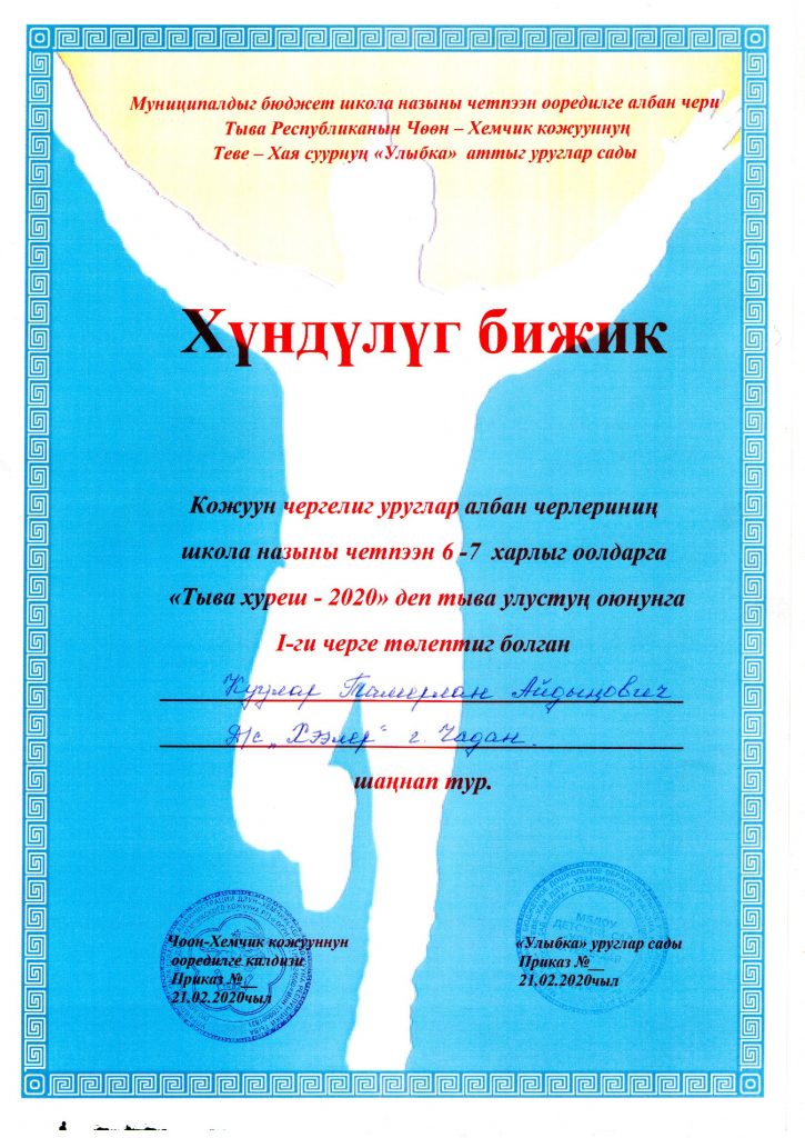 - Третье место: -Куулар Ринчен ( воспитанник подготовительной группы);