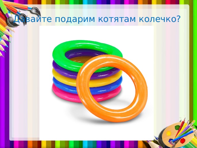 Цель: учить рисовать предметы круглой формы, слитным, не отрывистым движением кисти; закреплять знания цветов; учить детей рассматривать готовые работы, выделять равные красивые колечки; Воспитывать интерес к рисованию.