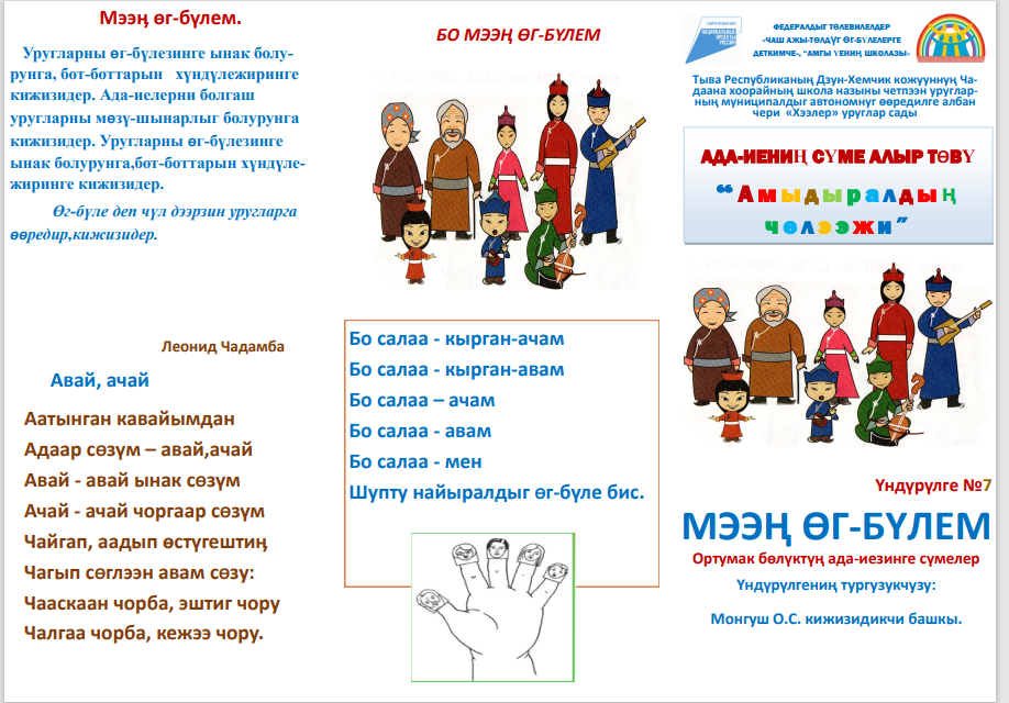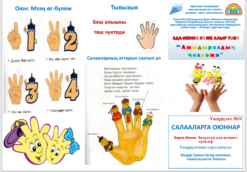 Хундулуг ада-иелер! Коронавирус деп коргунчуг халдавырлыг аарыг делегейнин улуг чурттарында тарап, улуг айыылды тургузуп турар. Баш бурунгаар аарыгны тодараткаш эмнеп-даа турар болза, аарыгдан камгаланмас болза, аарый берип болур дээрзин тодараткан. Ада-иелер баш бурунгаар ажы-толунернин ойнаар ойнаарактарын болгаш ургулчу тудар, сонуургаар чуулдерин кара саван-биле изиг сугларга хунде 3-4 катап чуп берип турарынарны сагындырдывыс. Бо уеде силер уругларынар-биле бистин кижизидикчи башкыларывыстын арга-сумезин ажыглап чаа-чаа оюннарны, билиглерни кады шингээдип, уругларны алаактырып, кады ойнавышаан, ооредирин кузедивис. Мону кылыры берге-даа бол, уругларывысты деткип, кады бир демниг дыштанып, кижизидилгениң чыгдынган байлак аргалары-биле уругларывысты таныштыраалынар (баштак, чагыг, сургаал, йөрээл, угаадыг, сагындырыг, дилег, чеме, хоруг, көгүдүг, шоодуг дээш өске-даа аргалар) #демнигчорук Уругларынар-биле ооренмишаан ойнаарынга ажыглаар шолулгелер (ссылкалар): -Уругларынар-биле шимченгир оюннар ойнаксап турар болзунарза мону базывыт: https://daynotes.ru/podvignie_igri_dlya_detey_v_pomeshenii/